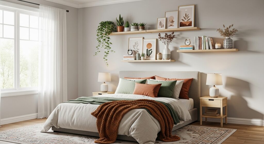 If your bedroom feels cluttered or plain, floating shelves are a perfect solution.