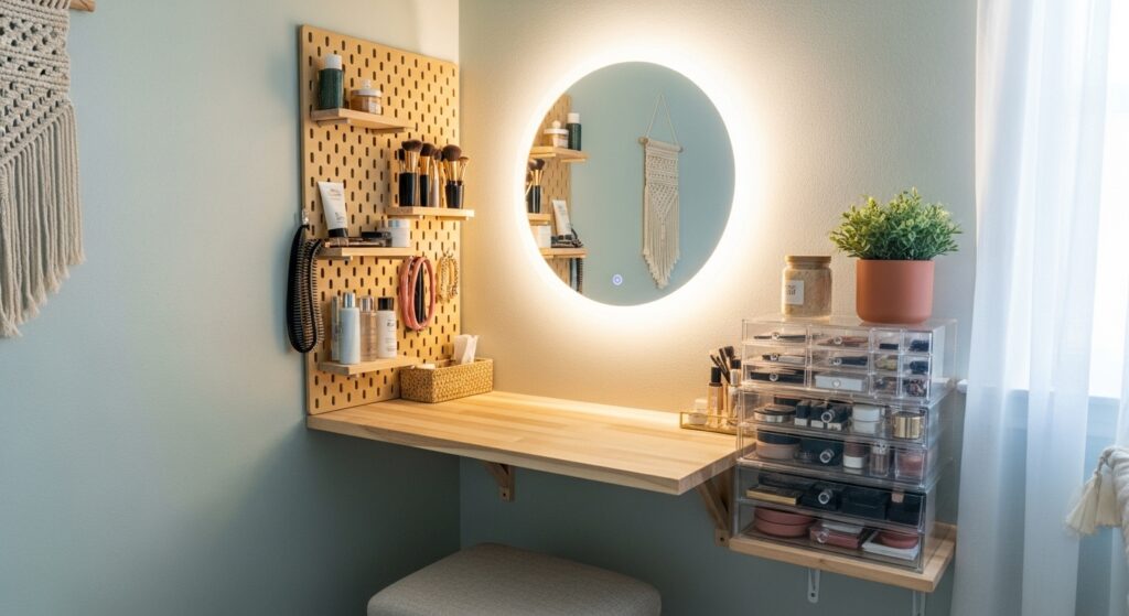 Use a small desk, mirror, and storage baskets to keep your essentials organized. Add a cute stool or chair for comfort.