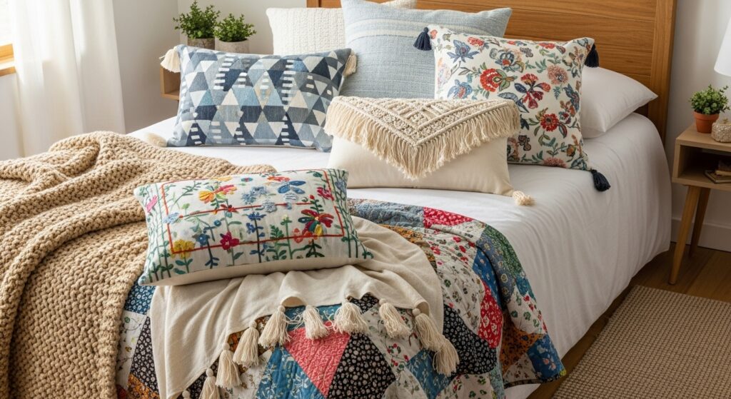 Use patterned fabrics or mix and match textures, such as linen, velvet, or cotton. Add tassels or embroidery for charm.