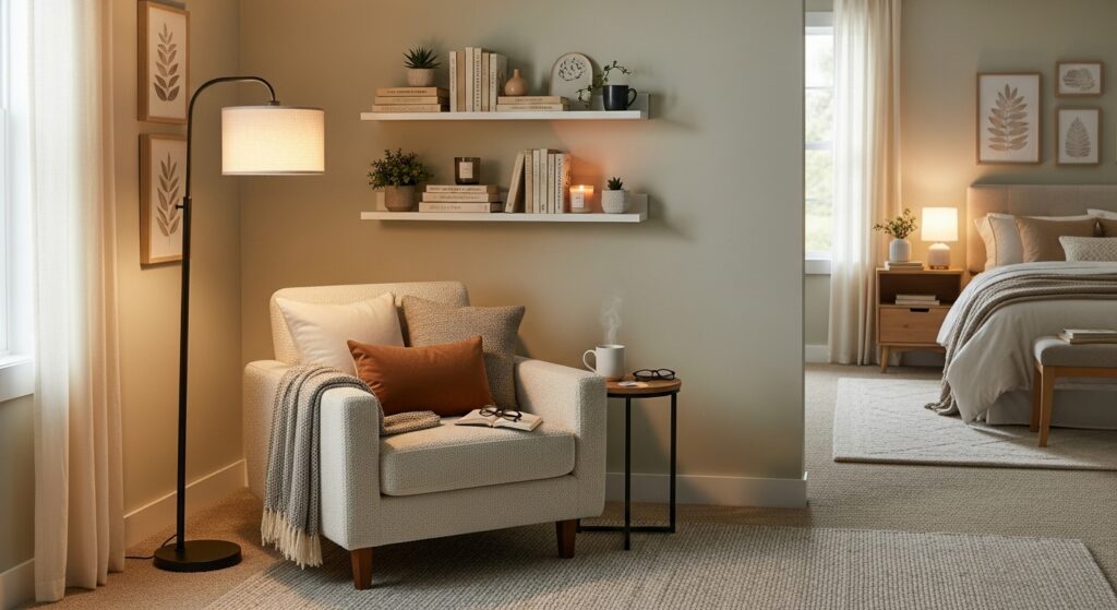 Add a comfy chair, a small bookshelf, and a warm throw blanket. Include a soft rug and a floor lamp to make it inviting and cozy.