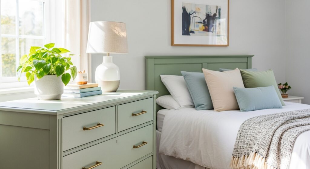 A fresh coat of paint in calming tones can instantly change the look of your bedroom. Add modern handles or decorative knobs to complete the makeover.
