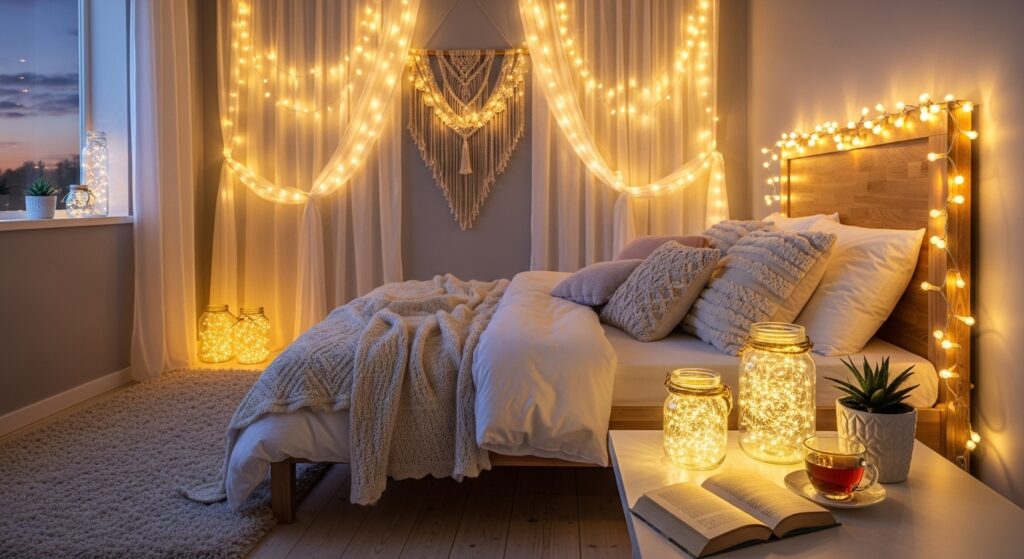 Lighting plays a huge role in creating a relaxing vibe. Fairy lights are a budget-friendly way to make your room glow beautifully.