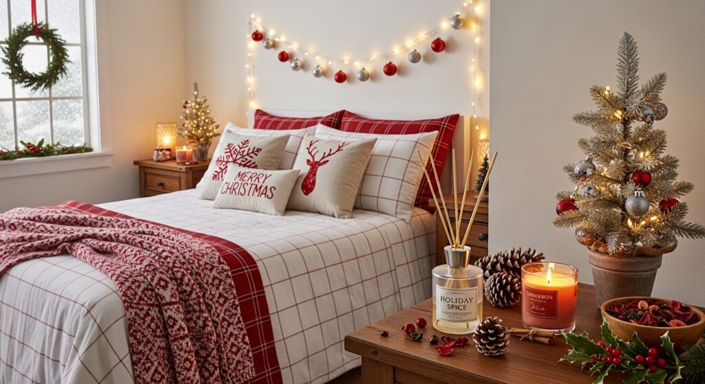 The scent of cinnamon, pine, or vanilla instantly makes your bedroom feel festive and inviting.