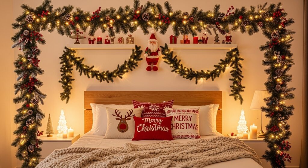 Fairy lights bring instant holiday charm without taking up much space. Wrap them around your headboard, mirror, or window frame for a soft, festive glow.