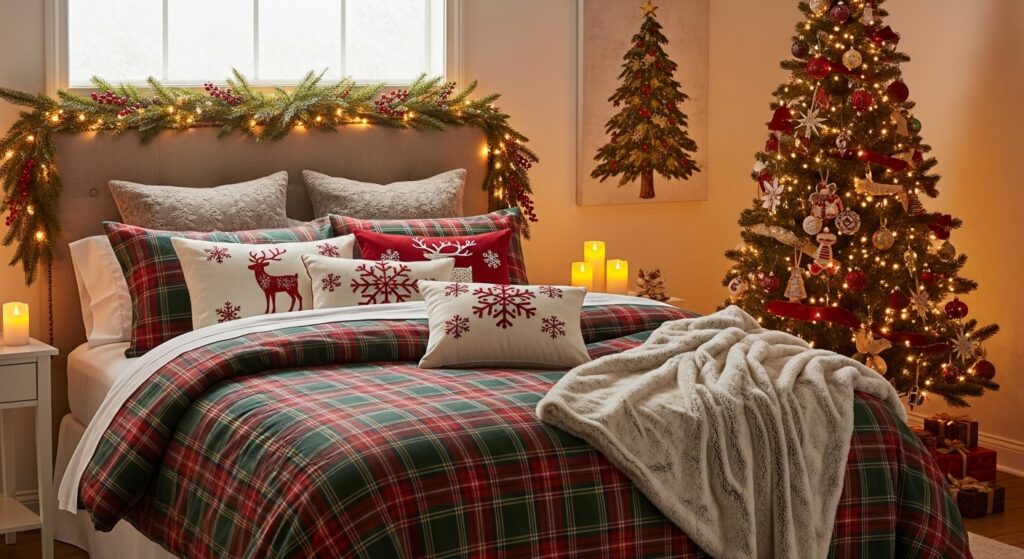 Finish with a few decorative pillows featuring snowflakes, reindeer, or Christmas tree designs.