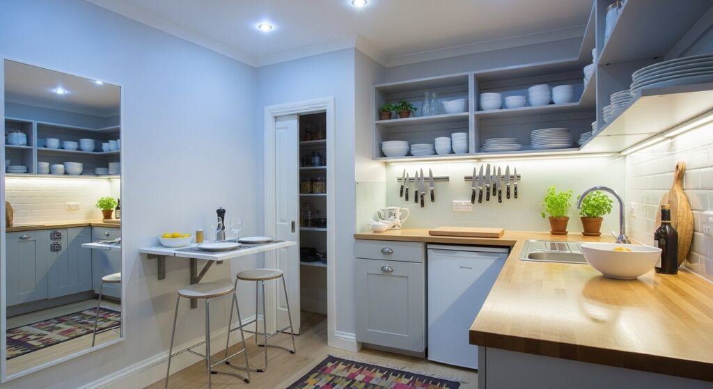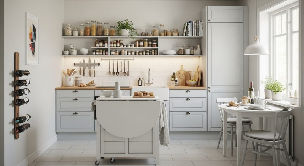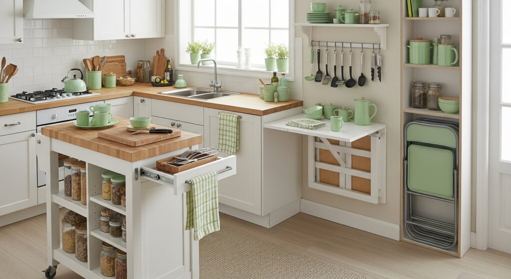 In a small kitchen, flexibility is key. Foldable tables, wall-mounted drop-leaf counters, and extendable dining sets can give you extra space when needed and tuck away when not in use.
