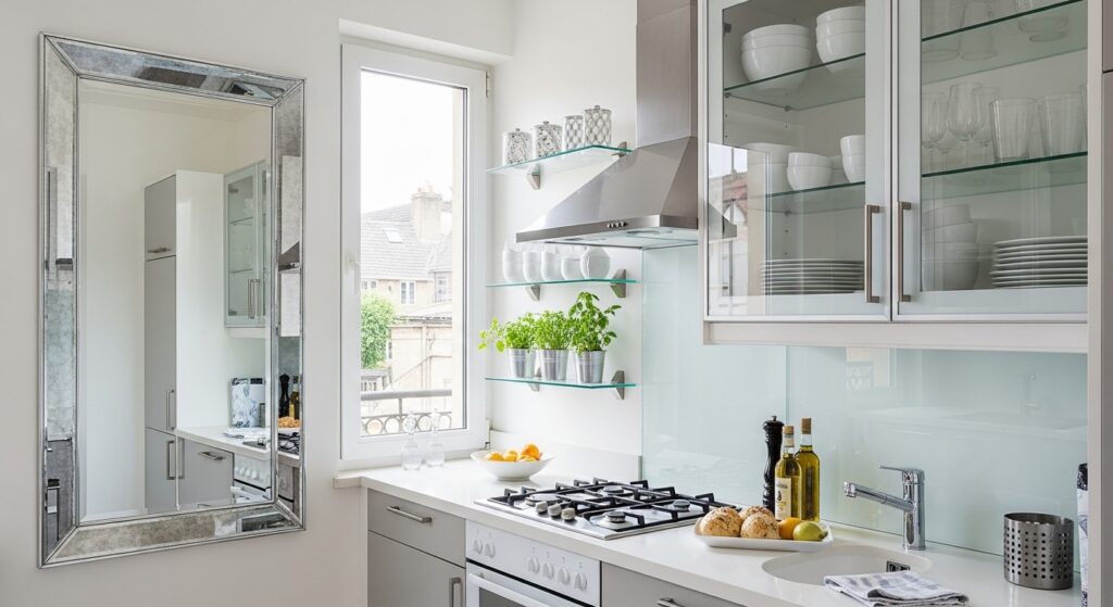 Mirrors aren’t just for bedrooms or bathrooms. In a kitchen, they reflect light and create the illusion of more space.