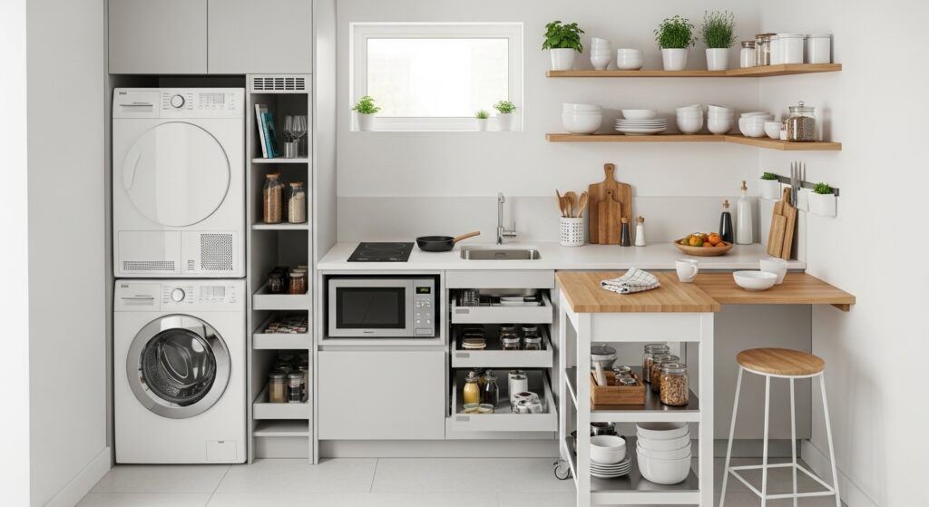 Smart storage solutions, such as pull-out drawers, vertical racks, and hidden organizers, work best in maximizing small spaces.