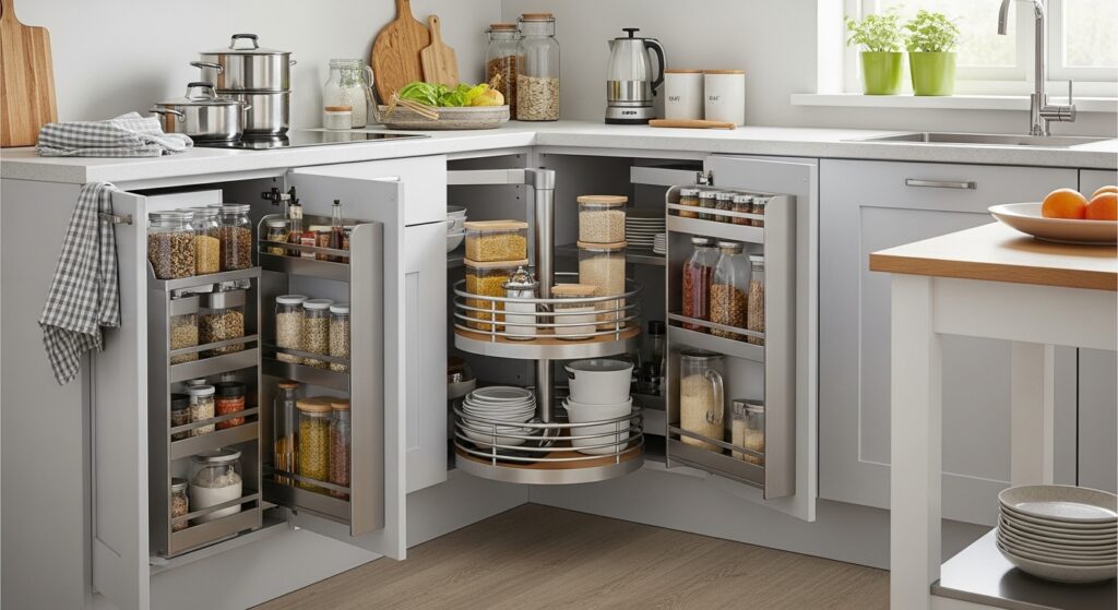 For example, a pull-out pantry or corner carousel can hold spices, snacks, or cookware without cluttering countertops.