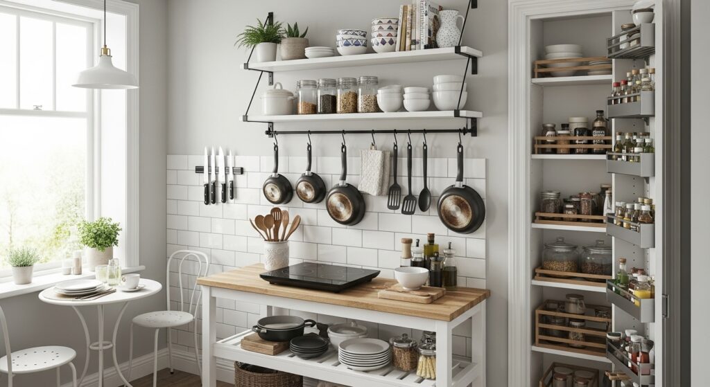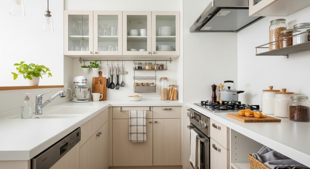 Hidden storage can be a lifesaver in a small kitchen. Installing pull-out shelves, rotating trays, and drawer dividers helps you maximize every inch.