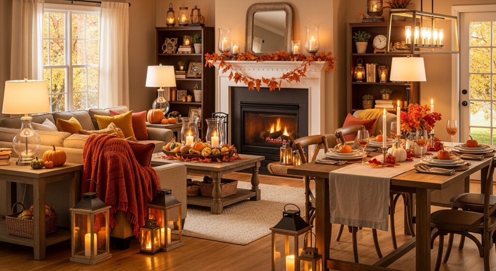 Lighting plays a crucial role in fall décor. Swap harsh overhead lights for warm, soft glows.