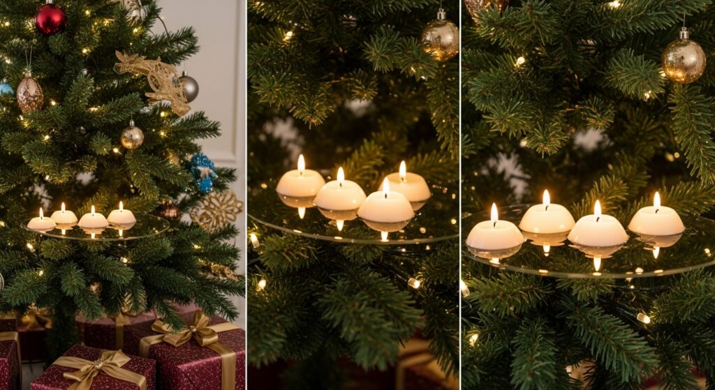 Use battery-operated LED candles hung with transparent fishing wire. They’re lightweight, safe, and give a realistic floating illusion.