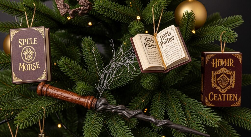Turn your tree into a magical library with mini spell books and wand decorations. Print tiny covers of famous spells like Lumos or Wingardium Leviosa and hang them with twine.