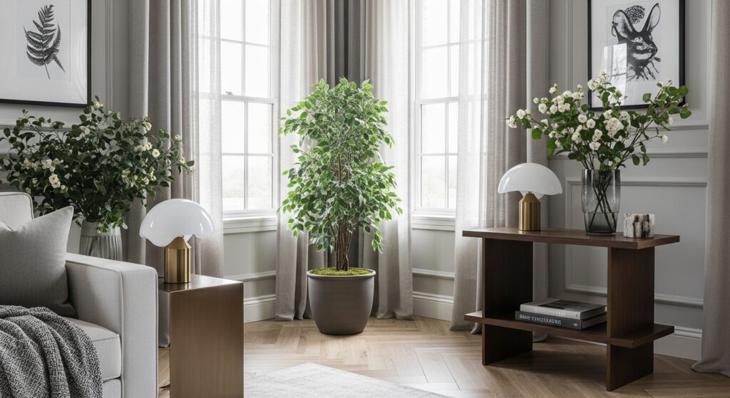 Pair it with metallic décor, such as gold planters or silver vases, for a modern glam effect.