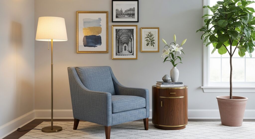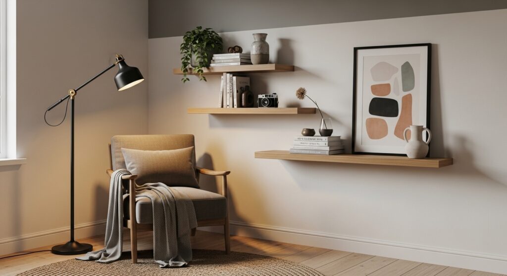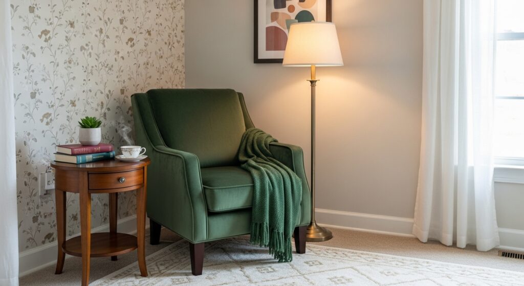 Transform your corner into a peaceful reading retreat. A soft armchair, paired with a warm floor lamp, adds both comfort and charm.