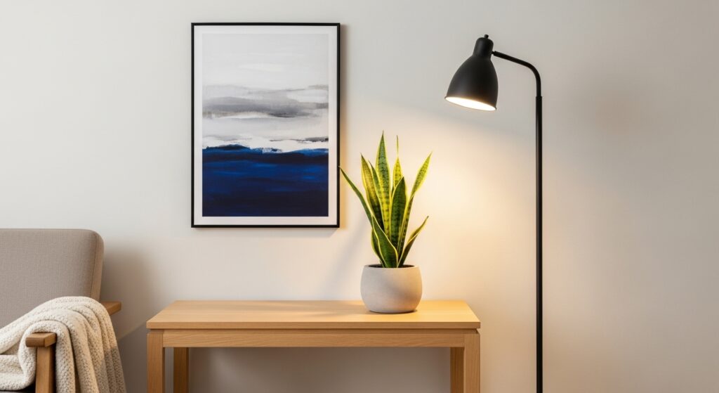 A tall floor lamp adds height, light, and elegance without taking up much space.