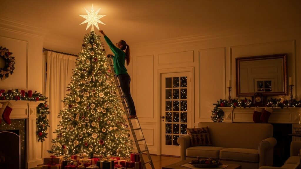 Pick a large, lightweight topper that’s at least 12–18 inches. Oversized stars, snowflakes, or crowns suit big trees. Match your theme and color palette.