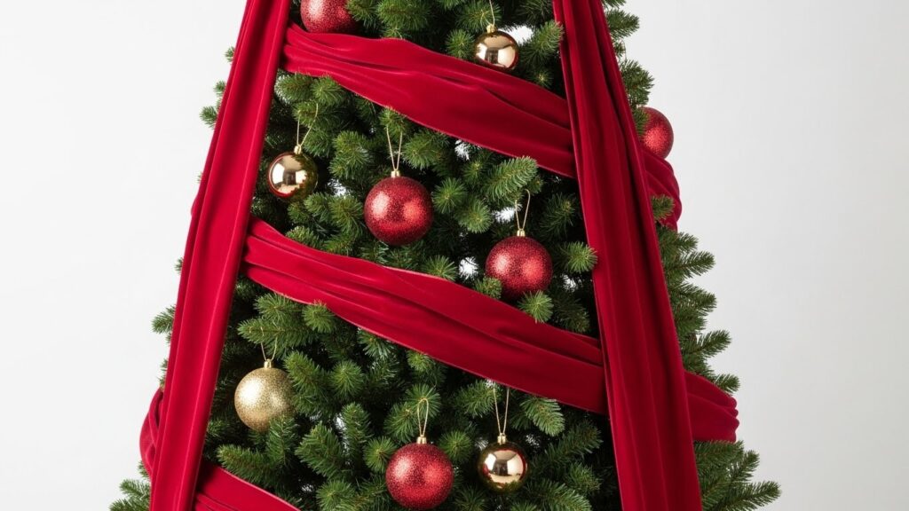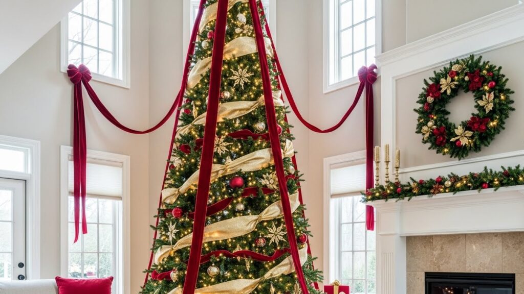 Use wide, wired ribbon for visibility on tall trees. Start at the top and weave diagonally, tucking loosely into branches.
