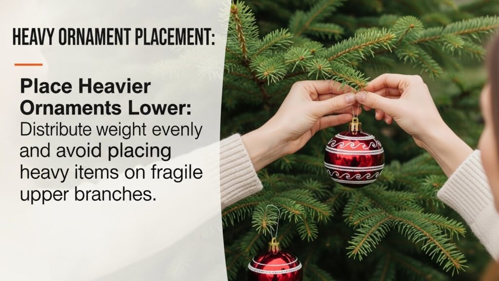 Place larger ornaments on the lower tree for visual weight, medium-sized ornaments in the middle, and small ornaments on top.