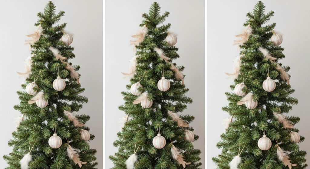 Use picks, ribbons, and layered garlands to add dimension without bulk. Fluff each branch to create an illusion of fullness.